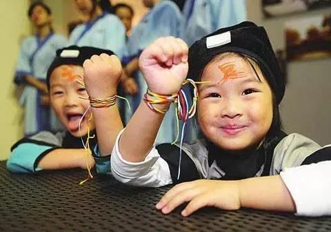 中国古代崇敬五色,以五色为吉祥色。因而,节日清晨,各家大人起床后第一件大事便是在孩子手腕、脚腕、脖子上系五色线,据说,系五色线的儿童可以避开蛇蝎类毒虫的伤害,扔到河里,意味着让河水将瘟疫、疾病冲走,儿童由此可以保安康。