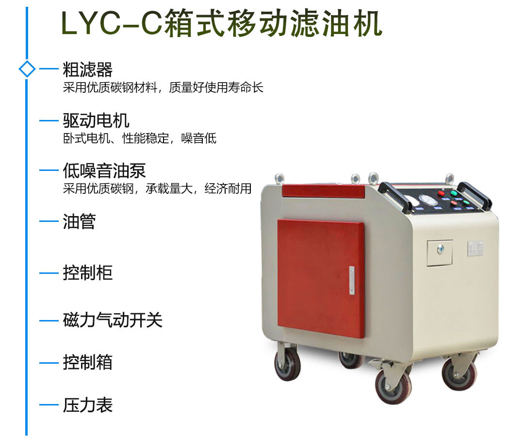 FLYC-100C防爆型箱式濾油機均采用防爆型,是普通型濾油車的一種新型產(chǎn)品,適合于石油、化工、航空航天等行業(yè)用來過濾汽油、柴油、煤油等易燃易爆介質(zhì)的場合。該濾油機的濾油器殼體采用快開結(jié)構(gòu),不需要任何工具,便能迅速快捷地打開上蓋,更換濾芯,方便快捷。同時面板上裝有壓力表,在工作時,可以連續(xù)指示出系統(tǒng)的運行狀況和濾芯的污染程度。我公司研制的箱式濾油車具有自吸能力強,性能穩(wěn)定,排污能力大等優(yōu)良特點。