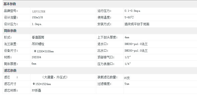 利菲爾特大流量保安過濾器結(jié)構(gòu)為圓柱形殼體,材質(zhì)為304或,316L不銹鋼;配以單支或多支濾芯。