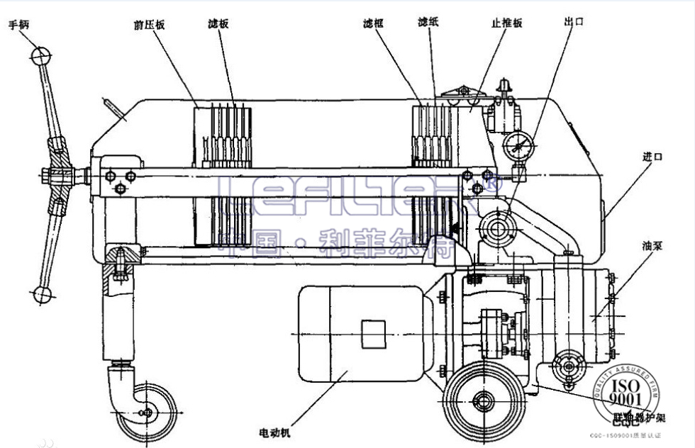 2、濾板和濾框間襯有作為介質(zhì)的濾紙或?yàn)V布,更換方便。憑借壓緊裝置的壓力將濾板和濾框固定形成一個(gè)單獨(dú)的過濾室,被壓緊在濾板和濾框之間的濾紙或?yàn)V布起過濾作用。