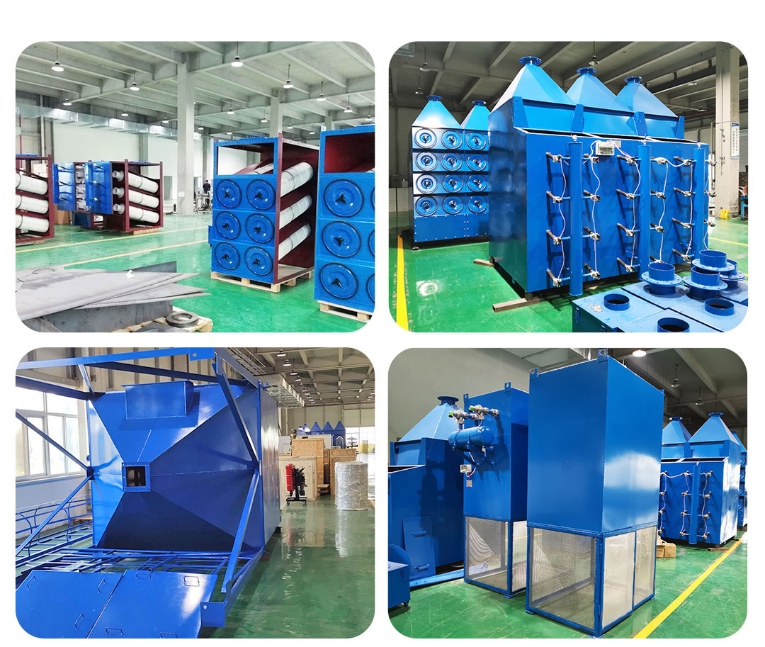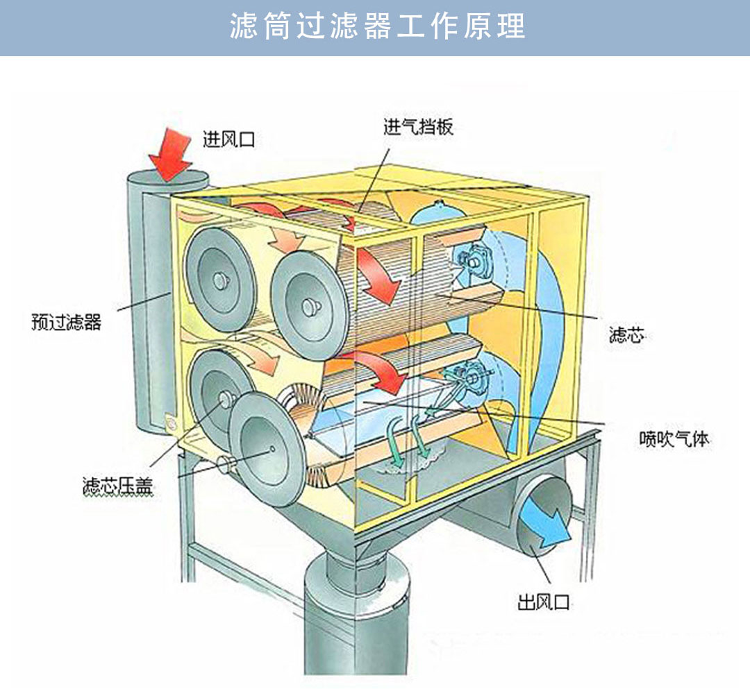 含塵廢氣進(jìn)入脈沖褶式濾筒除塵器進(jìn)風(fēng)口后,由于氣流截面突然擴(kuò)大及氣流分布板的作用,風(fēng)速驟降,氣流中一部分粗大顆粒在風(fēng)動力和慣性力的作用下相互碰撞,自然沉降到底部集灰斗;粒度細(xì)、密度小的塵粒,通過擴(kuò)散和篩濾等組合效應(yīng),沉積在濾筒濾料的外表面上而被攔截,潔凈的氣體穿透濾料內(nèi)壁,進(jìn)入潔凈室由排氣管經(jīng)風(fēng)機(jī)抽出。過濾元件濾筒的阻力,隨著濾料表面粉塵積累層厚度的增加而增大。噴吹控制方式可以分為壓差控制、時序控制、人工控制。例如壓差控制:當(dāng)阻力達(dá)到某一設(shè)定值時,數(shù)顯壓差儀表激發(fā)信號,脈沖控制儀或PLC控制程序收到反饋信號后,自動判斷數(shù)據(jù),下指令進(jìn)行連鎖執(zhí)行動作,自動進(jìn)行啟閉閥門噴吹清灰。此時,瞬間接通脈沖電源,電磁脈沖閥開啟,4公斤以上壓力的壓縮空氣瞬間引入周邊空氣作為二次放大的充足氣源,通過文氏管,一并高壓噴吹打入濾筒,使褶皺的濾筒瞬間膨脹變形鼓起,而產(chǎn)生振動,在高壓脈沖氣流沖刷的作用下,附著在濾筒外表面上的粉塵被一掃而光,掉入除塵器底部收集粉塵的灰斗收塵箱中。清灰完畢后,電磁脈沖閥關(guān)閉,濾料外表面粉塵清除后,阻力變小,濾料獲得再生,再次恢復(fù)攔截粉塵的功能。當(dāng)阻力上升時,再次自動循環(huán)清灰再生工作。