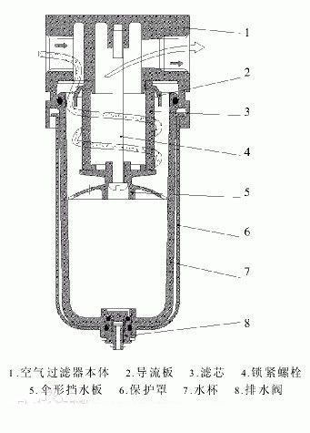 空氣過(guò)濾器的結(jié)構(gòu)如左圖所示 從進(jìn)口流入的壓縮空氣,被引進(jìn)導(dǎo)流板(2),