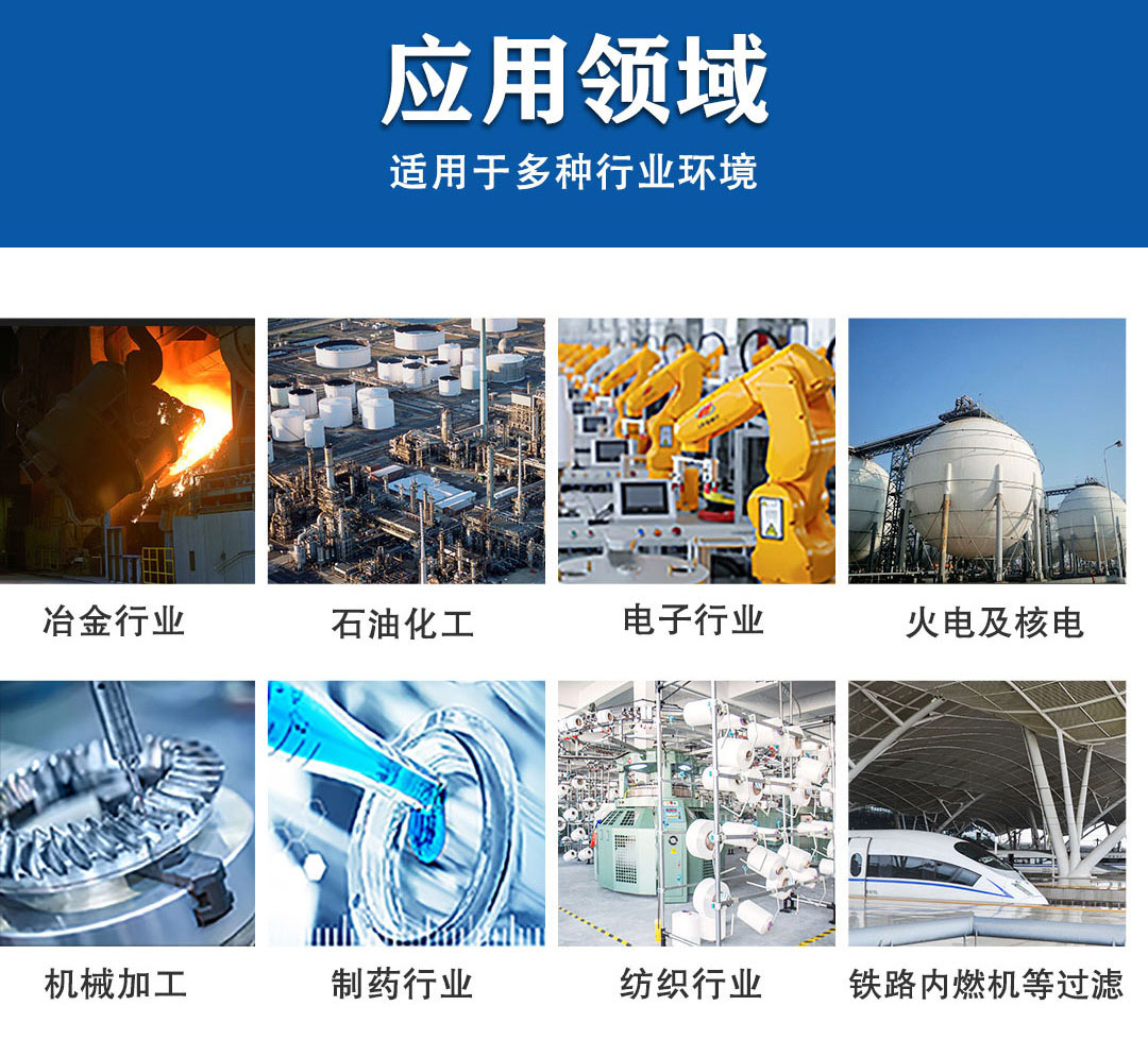 鋼鐵的高爐鼓風(fēng)、離心式空壓機、燃?xì)廨啓C、需長時間運轉(zhuǎn)的柴油機及汽輪機、對空氣潔凈度要求較高的集中式中央空調(diào)系統(tǒng)以及其它大型機組的入口過濾和粉塵涂裝的粉末回收系統(tǒng)