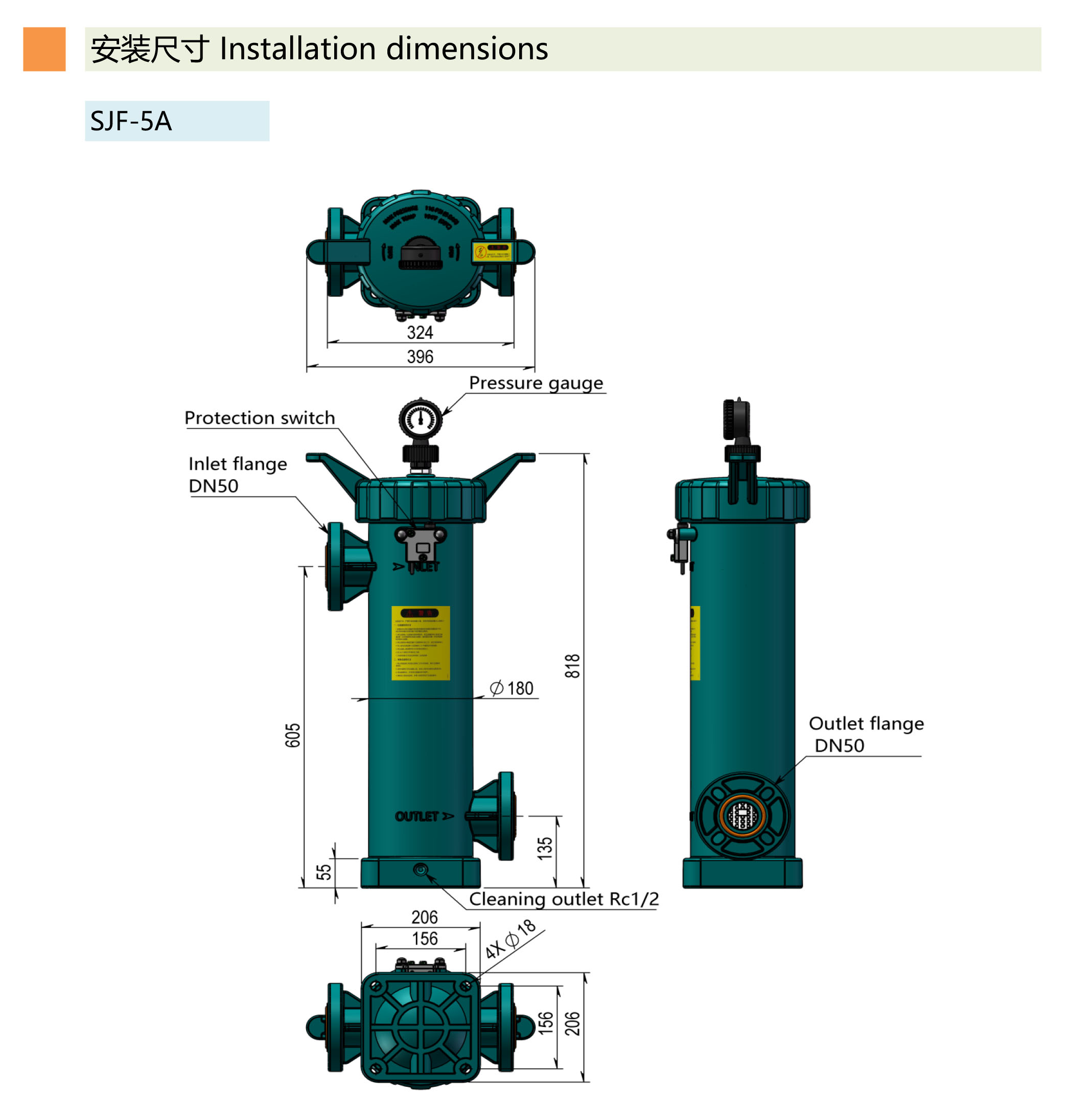 ●.進(jìn)出水口采用法蘭式連接,堅(jiān)固耐用,可配各國標(biāo)準(zhǔn)管道法蘭使用。